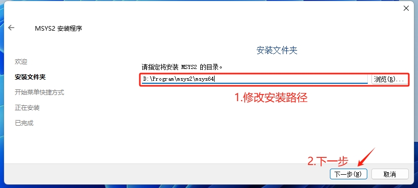 3. 默认安装路径为:“C:\msys64”,修改为自己的安装路径