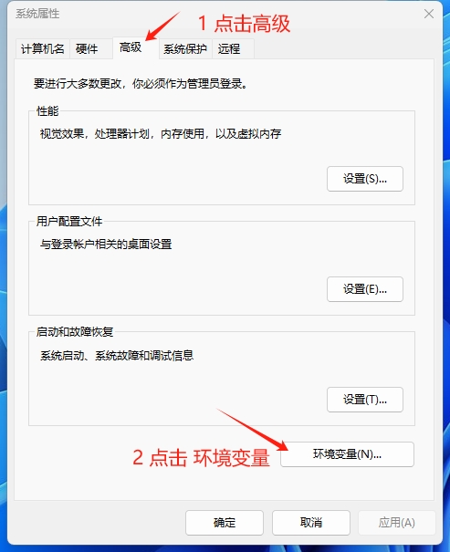 2. 在弹出窗口点击高级,点击环境变量
