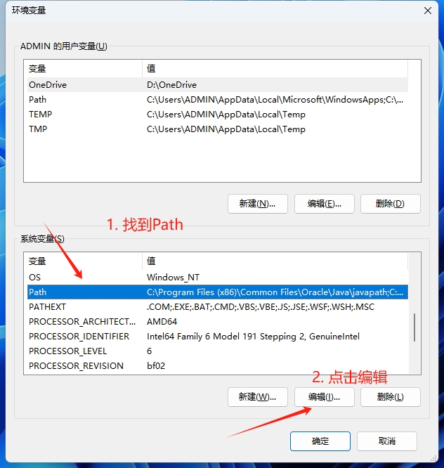 3. 在系统变量找到path,选中后,点击编辑