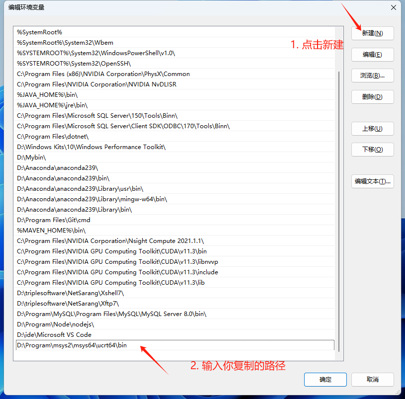 6. 在打开的环境变量,修改path下,新建,复制你的路径,然后一直点确定退出为止