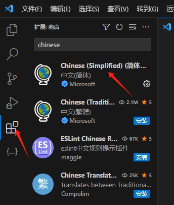 1. 打开vscode,按住键盘ctrl+shift+x(或者点击左边箭头指向菜单项),搜索chinese,下载第一个,即可汉化vscode,当然这个看个人喜好