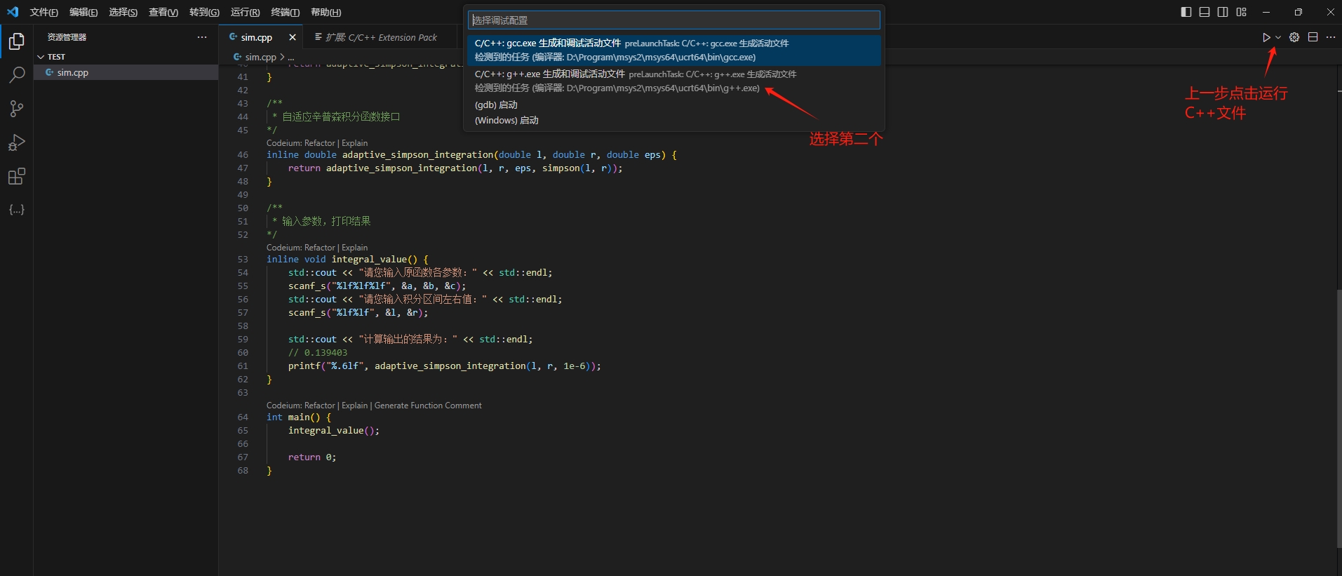 6. 点击右上角的下箭头,下拉列表选择运行C/C++文件(没有出现中文乱码就忽略下图第二步)