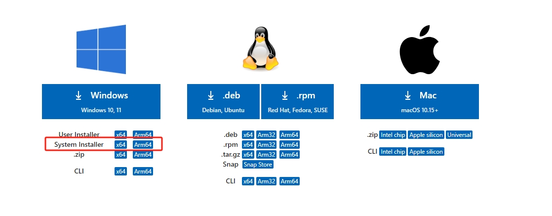 相信看到这篇文章的朋友已经下载好vscode,如果没有下载好,也没有关系,官网下载连接:link,Windows X64我建议下载为系统安装的,点击X64